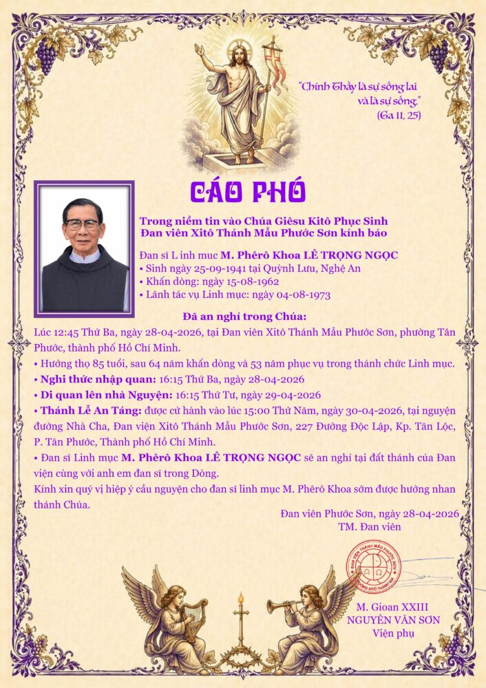 Cáo phó – Đan sĩ Linh Mục M. Phêrô Khoa Lê Trọng Ngọc (Đan viện Phước Sơn)