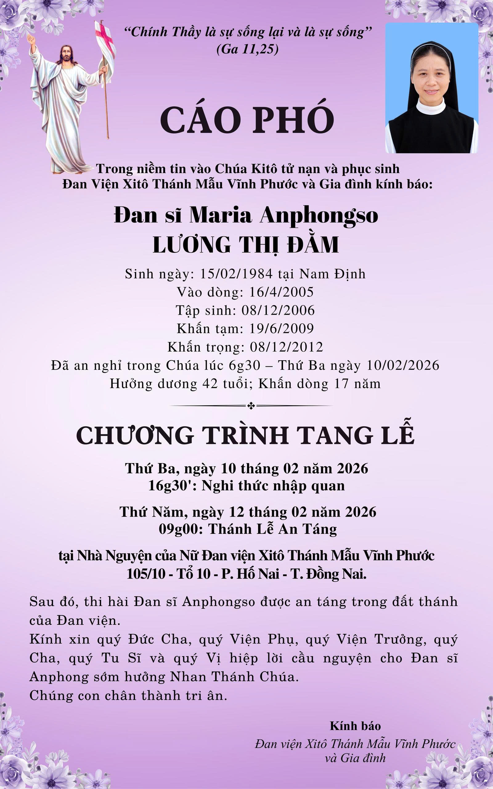 Cáo phó – Đan Sĩ Maria Anphongso Lương Thị Đằm