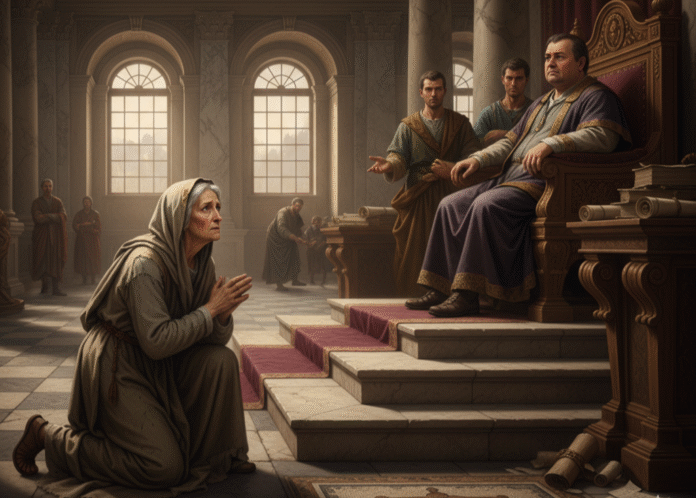 Bà goá nghèo chẳng còn gì để sống. Bà chẳng thể tự bảo vệ mình. Kẻ thù thì mạnh thế. Nếu không có ai trợ giúp bà không thể sống được. Vì thế bà tha thiết khẩn cầu để được cứu giúp. Bà kiên trì vì đó là lẽ sống của bà. Nên bà chỉ ngưng khẩn cầu khi đạt tới sự sống.