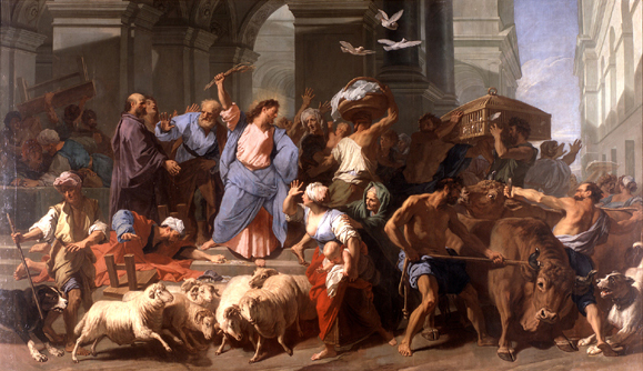 Gần đến lễ Vượt Qua của người Do Thái, Chúa Giêsu lên thành Giêrusalem. Người thấy trong Ðền Thờ có những kẻ bán chiên, bò, bồ câu, và những người đang ngồi đổi tiền. Người liền lấy dây làm roi mà xua đuổi tất cả bọn họ cùng với chiên bò ra khỏi Ðền Thờ; còn tiền của những người đổi bạc, Người đổ tung ra, và lật nhào bàn ghế của họ. Người nói với những kẻ bán bồ câu: “Ðem tất cả những thứ này ra khỏi đây, đừng biến nhà Cha tôi thành nơi buôn bán”. Các môn đệ của Người nhớ lại lời đã chép trong Kinh Thánh: Vì nhiệt tâm lo việc nhà Chúa, mà tôi đây sẽ phải thiệt thân.