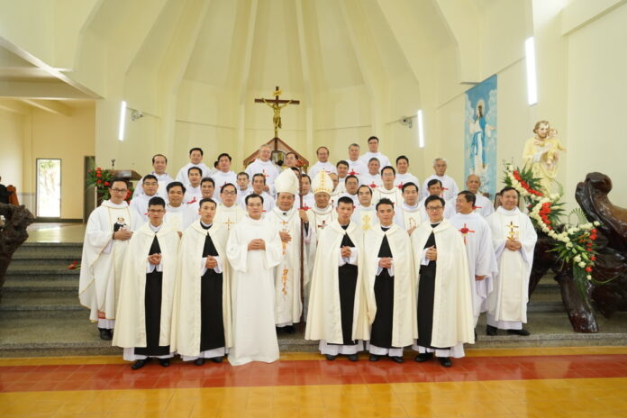 Thánh lễ trọng thể do Đức Cha Giuse Châu Ngọc Tri, Giám mục giáo phận Lạng Sơn – Cao Bằng, cũng là vị giảng tĩnh tâm năm cho Đan Viện năm nay. Cùng đồng tế với Đức Giám mục Giuse có Viện phụ Vianney Nguyễn Tri Phương, Viện phụ đương nhiệm của Đan Viện Châu Sơn và ngài đại diện Giáo hội nhận lời tuyên khấn của các anh em trong cộng đoàn. Ngoài ra có khoảng 40 linh mục gồm quý cha khách, quý cha là thân nhân của khấn sinh và là các linh mục trong Đan Viện. Về phía cộng đoàn phụng vụ tham dự thánh lễ cũng khá đông đảo: gồm hầu hết các thành viên trong gia đình Đan Viện, đại diện các Hội dòng trong hạt Đơn Dương, các Hội dòng có liên hệ cùng với qúy ông bà cố và thân nhân gia đình các tân khấn sinh.