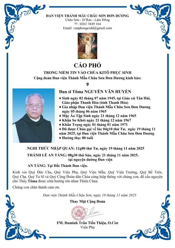 Trang chủThông BáoCáo Phó Cáo Phó Đan viện Xitô Thánh Mẫu Châu Sơn Đơn Dương – Cáo Phó Đan sĩ M. Tôma Nguyễn Văn Huyền Bởi : Châu Sơn Đơn Dương 19 Tháng mười một, 2025 InFacebookXPinterestWhatsApp 🔊 0:00 1.0x ⬇ 🗣️ 🎙️ Nữ miền Nam🎙️ Nam miền Nam Bài trướcNén bạc bị cất trong khăn (Lc 19,11–28 – Thứ Tư, Tuần XXXIII, Thường niên)Bài tiếp theo“Chớ gì hôm nay ngươi nhận ra điều đem lại bình an!” (Lc 19,41-44 – Thứ Năm Tuần XXX, Thường niên) Chia sẻ InFacebookXPinterestWhatsApp Bài viết liên quan Suy niệm hằng ngày Thứ Ba Tuần II Phục Sinh, Cv 4,32-37; Ga 3,7-15 Kitô hữu sống Tin Mừng Suy niệm hằng ngày Thứ Hai Tuần II Phục Sinh, Ga 3,1-8 Để hưởng Nước Thiên Chúa Suy niệm Chúa Nhật - Lễ Trọng Chúa nhật II Phục sinh – A: Đôi cánh tin – yêu (Đức TGM Giuse Ngô Quang Kiệt) BÀI VIẾT MỚI Suy niệm hằng ngày Thứ Ba Tuần II Phục Sinh, Cv 4,32-37; Ga 3,7-15 Kitô hữu sống Tin Mừng Suy niệm hằng ngày Thứ Hai Tuần II Phục Sinh, Ga 3,1-8 Để hưởng Nước Thiên Chúa Suy niệm Chúa Nhật - Lễ Trọng Chúa nhật II Phục sinh – A: Đôi cánh tin – yêu (Đức TGM Giuse Ngô Quang Kiệt) Suy niệm Chúa Nhật - Lễ Trọng CN II PS Năm A – (Cv 2,42-47; 1Pr 1,3-9; Ga 20, 19-31). Lòng Chúa thương xót nơi Đức Kitô Phục Sinh Suy niệm Chúa Nhật - Lễ Trọng Chúa nhật II Phục sinh Ga 20,19-31 “Ngợi ca Lòng Thương Xót…” Xem thêm