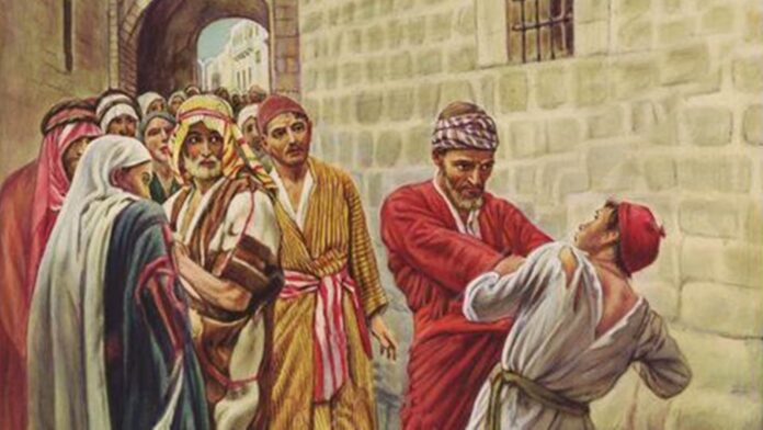 Bây giờ chúng ta tiếp tục câu chuyện dụ ngôn Chúa Giê-su đang kể. Người nói tiếp: “Nhưng vừa ra đến ngoài, tên đầy tớ gặp một người đồng bạn, mắc nợ y một trăm quan tiền. Y liền túm lấy, bóp cổ mà bảo: “Trả nợ cho tao!” Bấy giờ, người đồng bạn sấp mình xuống van xin: “Thưa anh, xin rộng lòng hoãn lại cho tôi, tôi sẽ lo trả anh”. Nhưng y không chịu, cứ đi tống anh ta vào ngục cho đến khi trả xong nợ”.