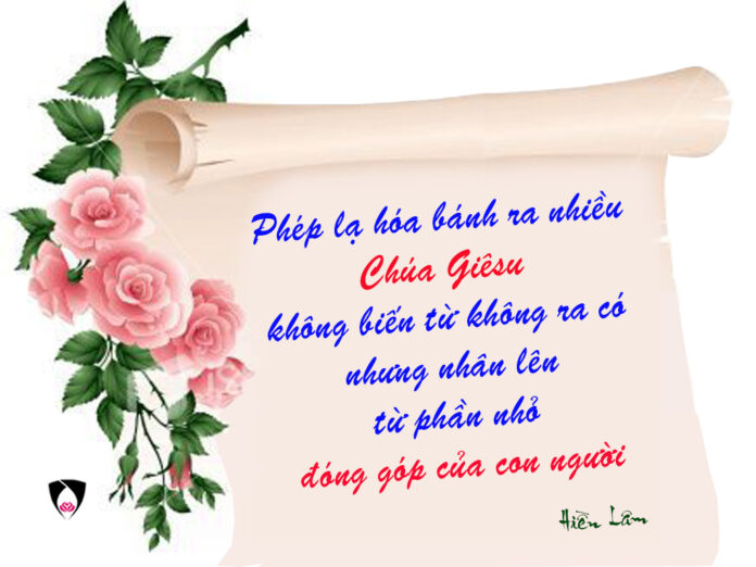 Chúa Giêsu không dùng quyền năng để hô biến đem của ăn từ đâu tới, nhưng Người muốn con người cộng tác dâng lên của ăn từ bàn tay lao động của con người (nghề trồng trọt – bánh; nghề đánh lưới – cá). Phép lạ xảy ra khi biết đem chia sẻ cho nhau và cùng ngồi xuống ăn chung với nhau, chứ phép lạ không thể xảy ra khi chúng ta giữ khư khư năm chiếc bánh và hai con cá để ăn một mình.