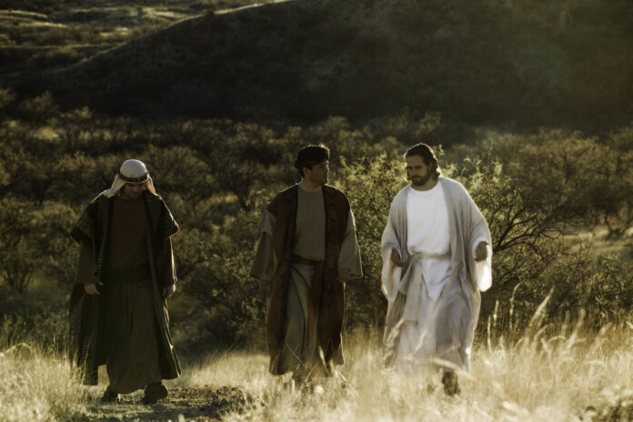 Cũng ngày hôm ấy, có hai người trong nhóm môn đệ đi đến một làng kia tên là Em-mau, cách Giê-ru-sa-lem chừng mười một cây số.Họ trò chuyện với nhau về tất cả những sự việc mới xảy ra. Đang lúc họ trò chuyện và bàn tán, thì chính Đức Giê-su tiến đến gần và cùng đi với họ. Nhưng mắt họ còn bị ngăn cản, không nhận ra Người. Người hỏi họ : “Các anh vừa đi vừa trao đổi với nhau về chuyện gì vậy ?” Họ dừng lại, vẻ mặt buồn rầu.