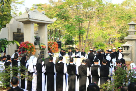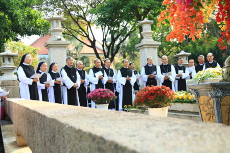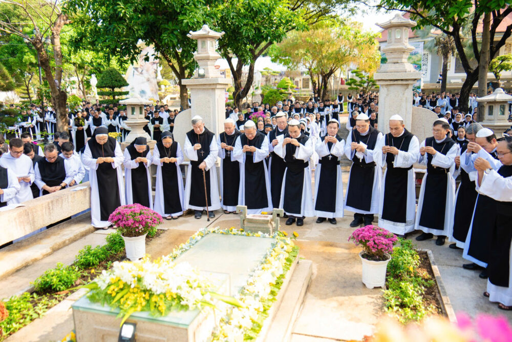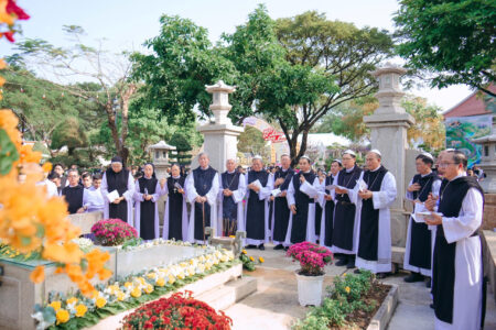 Trước lăng mộ Cha Tổ Phụ, cộng đoàn cùng nhau cử hành nghi thức tưởng niệm, lắng đọng trong thinh lặng và tri ân. Đó là giây phút trở về cội rễ, nhớ lại hành trình đức tin đầy hy sinh và phó thác của những bậc tiền nhân.