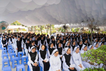 Cộng đoàn Phước Sơn long trọng đón tiếp quý Viện phụ, quý Viện Mẫu, quý Viện trưởng cùng toàn thể anh chị em Đan sĩ từ khắp mọi miền. Niềm vui gặp gỡ lan tỏa trong từng ánh mắt, nụ cười và cái bắt tay thân tình của những người cùng chung một nguồn mạch.