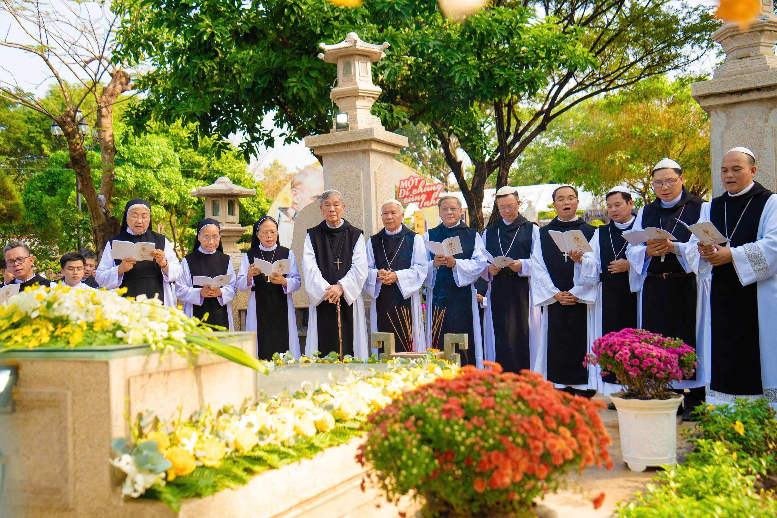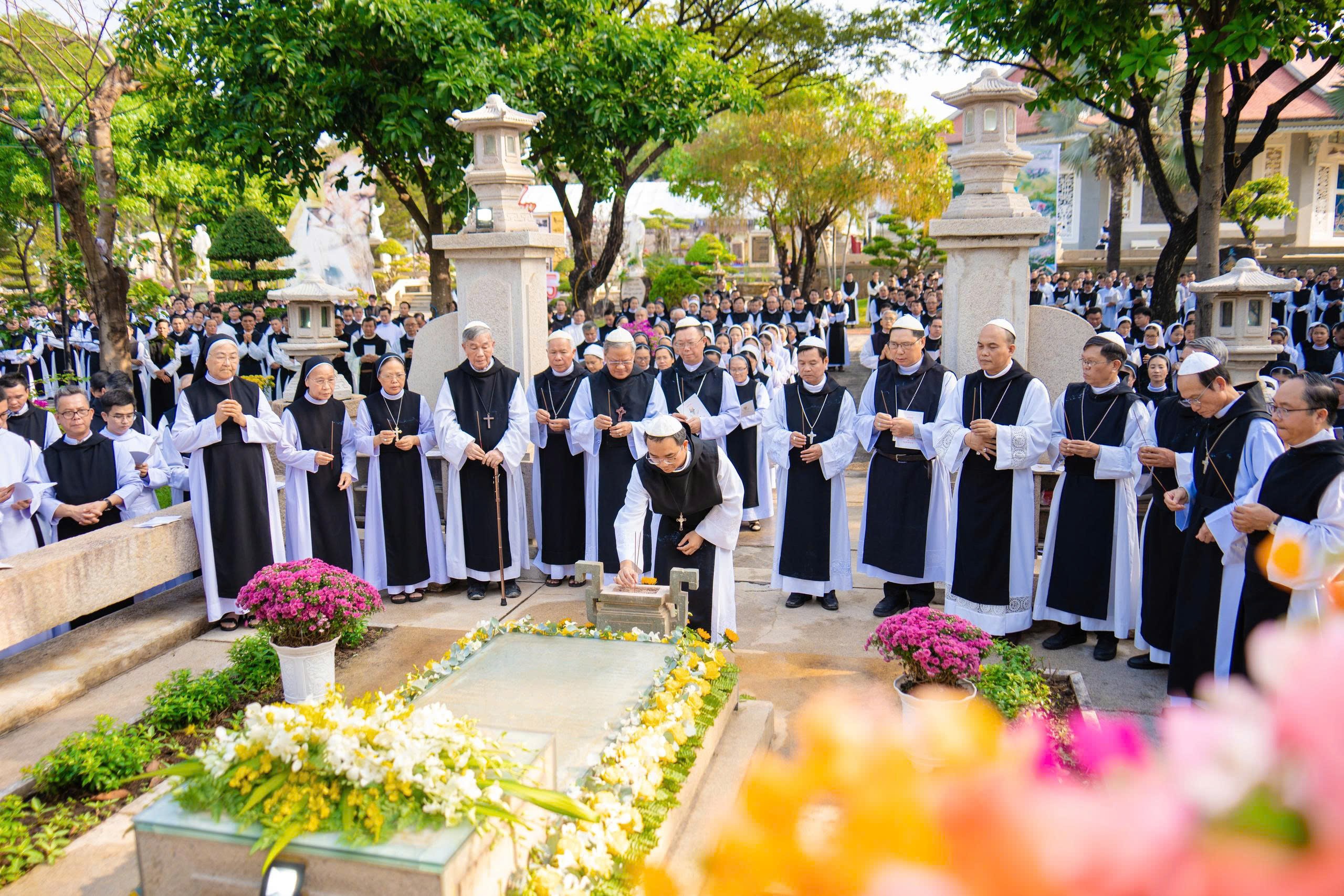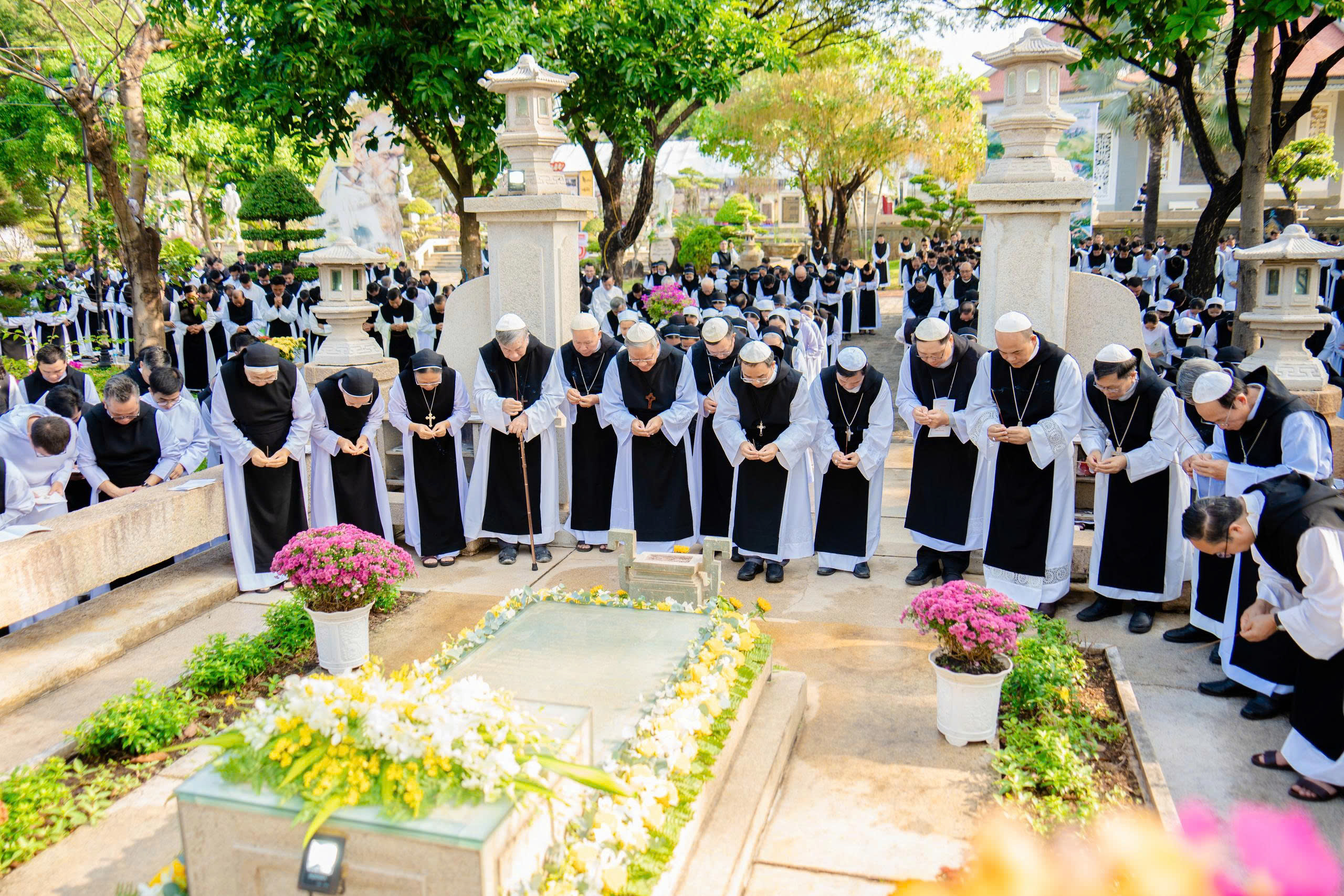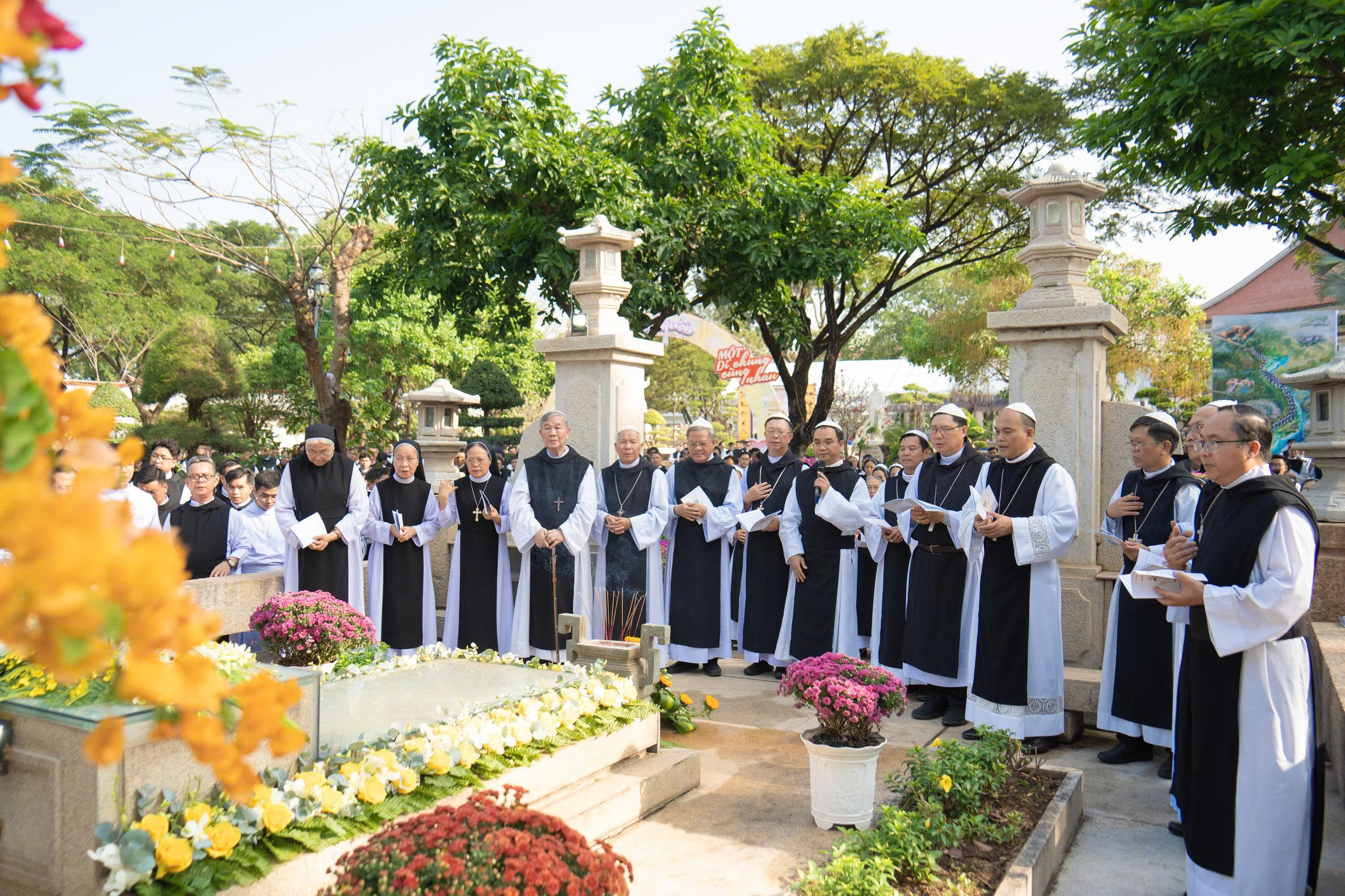 Trước lăng mộ Cha Tổ Phụ, cộng đoàn cùng nhau cử hành nghi thức tưởng niệm, lắng đọng trong thinh lặng và tri ân. Đó là giây phút trở về cội rễ, nhớ lại hành trình đức tin đầy hy sinh và phó thác của những bậc tiền nhân.