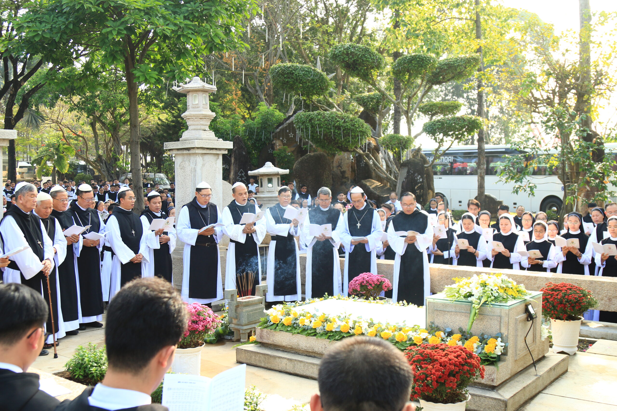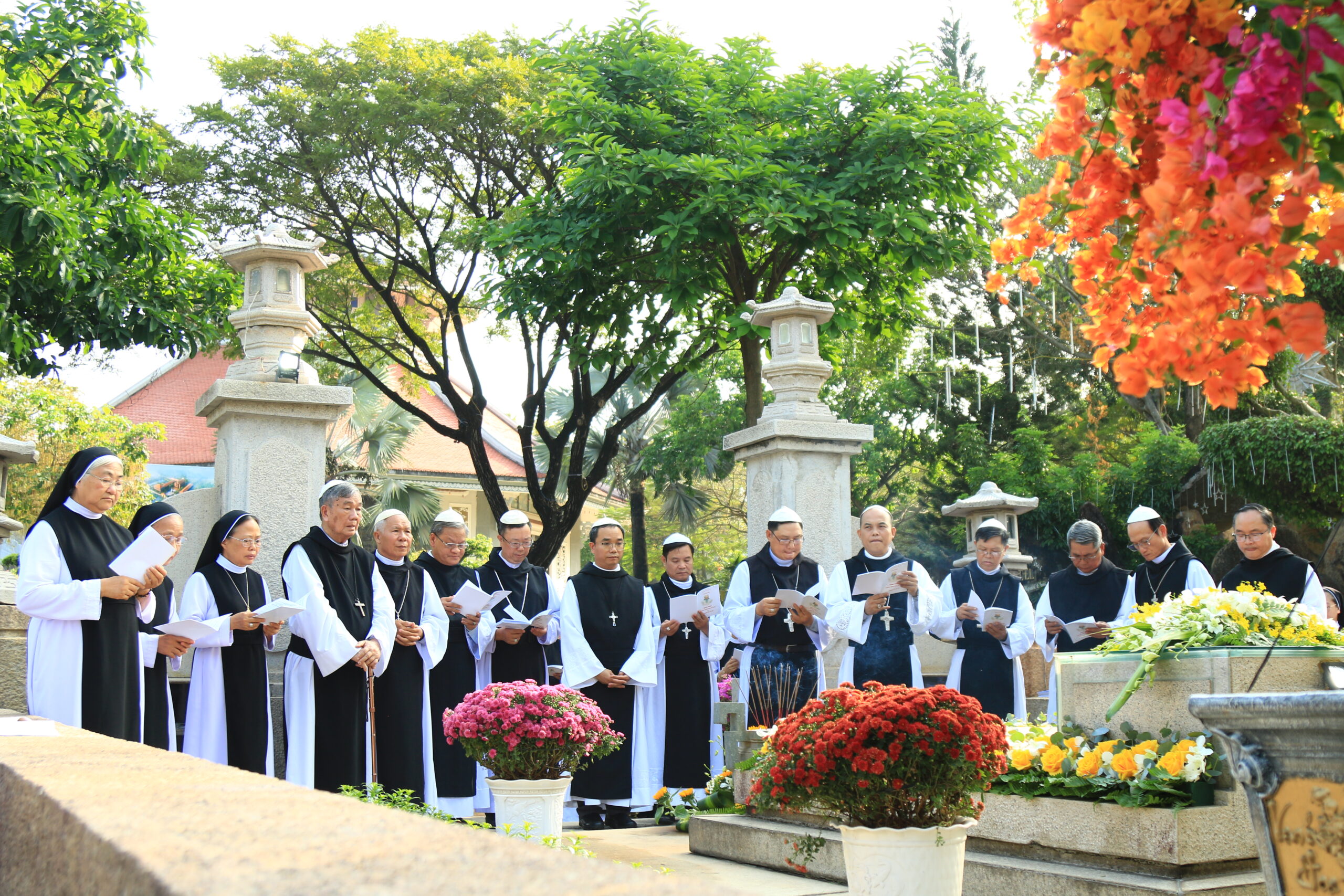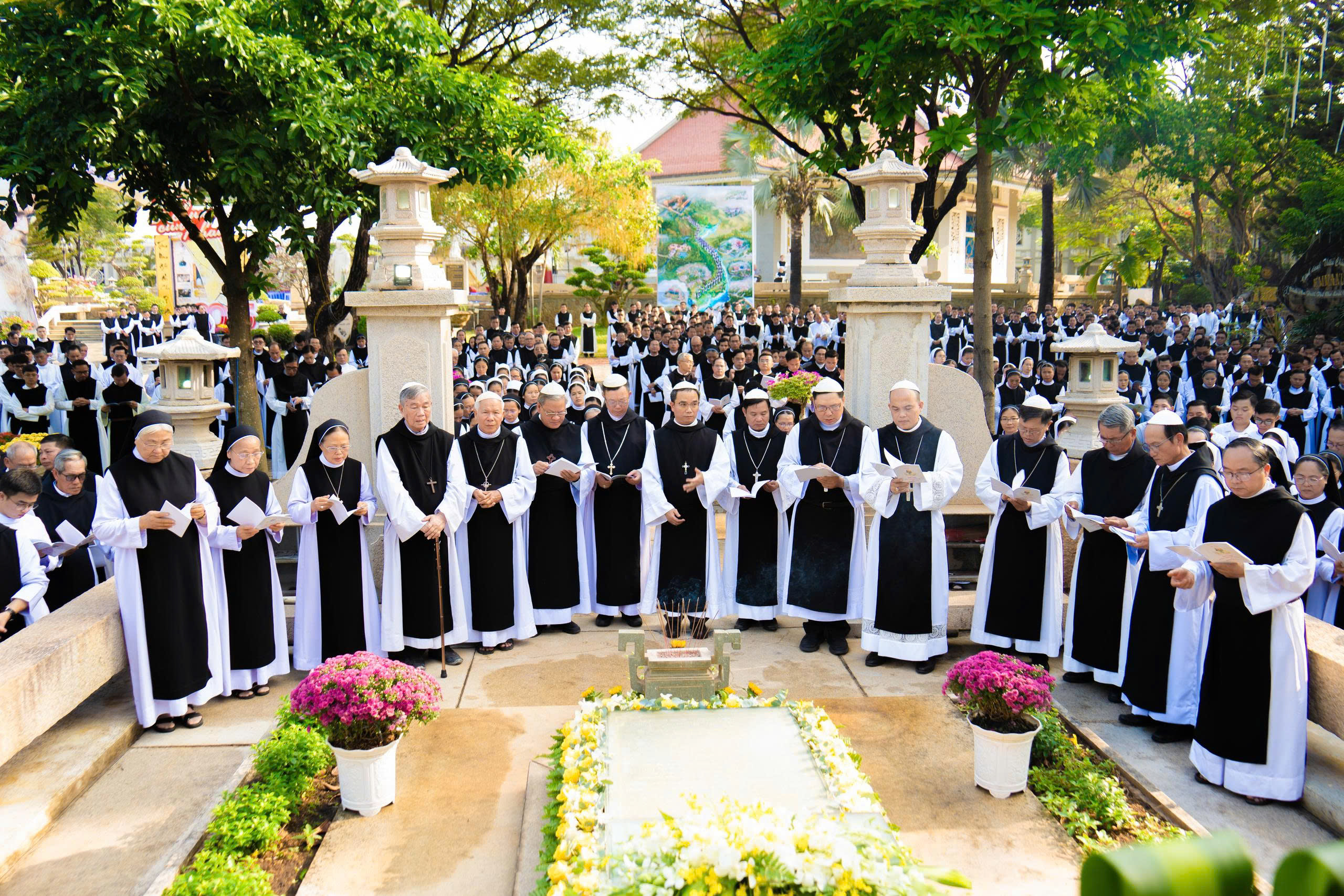 Trước lăng mộ Cha Tổ Phụ, cộng đoàn cùng nhau cử hành nghi thức tưởng niệm, lắng đọng trong thinh lặng và tri ân. Đó là giây phút trở về cội rễ, nhớ lại hành trình đức tin đầy hy sinh và phó thác của những bậc tiền nhân.