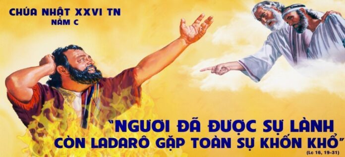 Qua bài Tin mừng, Chúa Giêsu kể dụ ngôn: “Có một nhà giàu kia, mặc toàn lụa là gấm vóc, ngày ngày yến tiệc linh đình. Lại có một người nghèo khó tên là Lazaro, mụn nhọt đầy mình, nằm trước cổng ông nhà giàu, thèm được những thứ trên bàn ăn của ông rớt xuống mà ăn cho no” (Lc 16,19-21). Chúa Giêsu muốn nói tới đức công bằng và tình bác ái làm nên phẩm giá của con người. Con người chỉ thực sự “là người” khi được ánh sáng Tin mừng chiếu soi, khi nó dựa trên nguồn cội tốt lành là chính Thiên Chúa. Sứ điệp của bài Tin mừng hôm nay thôi thúc mỗi người chúng ta nỗ lực sống đức công bằng và thực thi tình bác ái cụ thể trong môi trường mình đang sống: nơi cộng đoàn, trong giáo xứ, nơi công sở, trên đường đi…Bác ái là tâm điểm lời giáo huấn của Chúa Giêsu, là sự tóm lược toàn thể lề luật: “Ngươi phải yêu người thân cận như chính mình” (Mt 22,40). Bác ái mà Tin mùng hôm nay nói tới còn có một ý nghĩa sâu xa cho các Kitô hữu nhận thấy ý nghĩa của cuộc sống hiện tại: “Con ơi, hãy nhớ lại suốt đời con, con đã nhận phần phước của con rồi; còn Lazaro suốt đời chịu toàn những bất hạnh. Bấy giờ, Lazaro được an ủi nơi đây, còn con thì phải chịu khố khổ” (Lc 16,25).