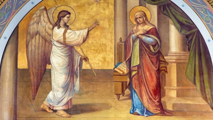 Sứ thần nói với Maria: “Thưa bà Maria, xin đừng sợ, vì bà đẹp lòng Thiên Chúa. Và này đây bà sẽ thụ thai, sinh hạ một con trai, và đặt tên là Giêsu. Người sẽ nên cao cả, và sẽ được gọi là Con Đấng Tối Cao. Đức Chúa là Thiên Chúa sẽ ban cho Người ngai vàng vua David, tổ tiên Người. Người sẽ trị vì nhà Giacóp đến muôn đời, và triều đại của Người sẽ vô cùng vô tận” (Lc 1,30-33). Thấy Đức Maria có vẻ hoang mang, Thiên sứ liền trấn an: “Thánh Thần sẽ ngự xuống trên bà, và quyền năng Đấng Tối Cao sẽ rợp bóng trên bà; vì thế, Đấng Thánh sắp sinh ra sẽ được gọi là Con Thiên Chúa” (Lc 1,35). Trong lúc Truyền Tin trong ngôi nhà ở Nazareth, Đức Maria đã đón chào sứ thần của Thiên Chúa, Mẹ chú tâm đến những lời của ngài. Mẹ đón nhận những lời ấy và đáp lại chương trình của Thiên Chúa, như thể bày tỏ lòng hoàn toàn sẵn sàng của Mẹ. Đến đây thì Đức Maria đã vui mừng và mạnh dạn thốt lên lời “Xin Vâng” tuyệt vời, tiếng vâng vĩ đại: “Này tôi là tôi tớ Chúa, xin làm cho tôi như lời sứ thần nói” (Lc 1,38). Về điều này Đức Giáo Hoàng Benedicto 16 viết: “Đức Maria đã được Thiên Chúa đặt trong những giây phút quyết định của lịch sử cứu độ và mẹ đã luôn biết phải đáp ứng thế nào với một tâm hồn hoàn toàn sẵn sàng”[7]. Từ nơi Đức Maria, Đấng Cứu Thế muôn dân hằng mong đợi đã đến mặc lấy bản tính nhân loại chúng ta[8]. Đức Thánh Cha Phanxicô giải thích thêm: “Tiếng vâng của Đức Maria trong biến cố truyền tin – nhờ tiếng vâng này, Đức Giêsu đã bắt đầu con đường của Người trên những nẻo đường của nhân loại”[9].