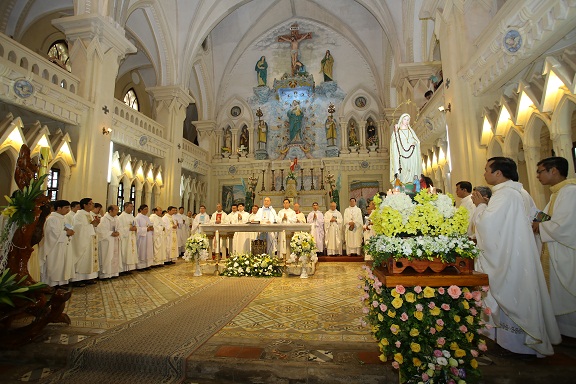 Thánh Lễ do Đức TGM Giuse Ngô Quang Kiệt chủ tế, đồng tế với ngài có Đức Cha Giuse Châu Ngọc Tri – Giáo phận Lạng Sơn – Cao Bằng, Đức cha Laurentio Chu Văn Minh – TGP Hà Nội và 120 linh mục đến từ nhiều giáo phận, cùng quý tu sĩ nam nữ, quy vị ân nhân và quý khách hành hương.