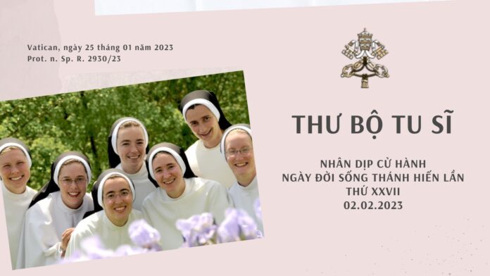 Vào thời điểm này, khi tinh thần hiệp hành đang được thổi bùng lên trong Giáo hội, chúng ta hân hoan cử hành Ngày Đời sống Thánh hiến lần thứ XXVII, vào ngày 02. 02, lễ Đức Mẹ Dâng Chúa Giêsu trong Đền thánh, tại Vương Cung Thánh Đường Đức Bà Cả. Lần này, vì không có sự hiện diện của Đức Thánh Cha Phanxicô, do ngài có chuyến tông du đến Cộng hòa Dân chủ Congo và Nam Sudan, nên việc cử hành Thánh lễ sẽ do Đức Hồng y Joao Braz de Aviz chủ sự. Với ngày này, chúng ta nhớ lại với tâm tình biết ơn hồng ân bao la của ơn gọi chúng ta thật sự là “một ký ức sống động về lối sống và hành động của Đức Giêsu” (Tông huấn Vita Consecrata số 22) và, ý thức rằng ân sủng của Người là đủ cho chúng ta (x. 2 Cor 12, 9), chúng ta cầu xin Người với lòng khiêm nhường và tín thác, để sống trung thành trong niềm vui và sự kiên trì.