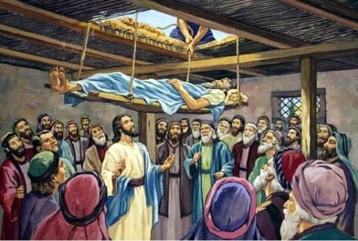 Trước sự cứng lòng và chậm tin đó, khi người bại liệt được đưa đến xin chữa trị, nhìn thấy đức tin của những người đã mang người bệnh đến với mình, Chúa Kitô đã đáp lại họ và nói với người bại liệt: “Tội lỗi của anh đã được tha thứ.” Những người Pha-ri-sêu và các kinh sư bắt đầu xì xào tỏ vẻ phản đối. Nhưng, để chứng minh rằng Ngài có quyền tha thứ tội lỗi, với một tình yêu mãnh liệt dành cho người bại liệt: Ngài chữa lành cho anh ta ngay trước sự chứng kiến của mọi người.