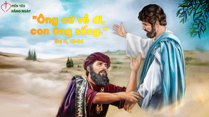 Trang Tin mừng hôm nay, thánh Gioan thuật lại dấu lạ Đức Giêsu cứu sống con trai viên sĩ quan cận vệ của nhà vua. Dấu lạ được thực hiện là nhờ lòng tin trong lòng viên sĩ quan, chứ không phải ở địa vị hay cách đánh giá bề ngoài người khác dành cho ông. Dù vẻ bề ngoài có như thế nào đi nữa thì trong tâm hồn viên sĩ quan này luôn vững lòng tin mạnh mẽ vào Đức Giêsu. Ông tin ngay cả khi Đức Giêsu có vẻ dửng dưng và thách thức trước lời nài xin tha thiết của ông (x. Ga 4,48). Lòng tin của ông không hề lay chuyển ngay cả khi Đức Giêsu không đến đụng chạm nâng con ông dậy theo như lời ông nài xin: “Thưa Ngài, xin Ngài xuống cho kẻo cháu nó chết mất !” Ông một mực tin vào lời quyền năng của Đức Giêsu: “Ông cứ về đi, con ông sống” và kết quả xảy ra đúng như điều đã ông tin. Thật vậy, mọi sự đều có thể đối với những ai có lòng tin.