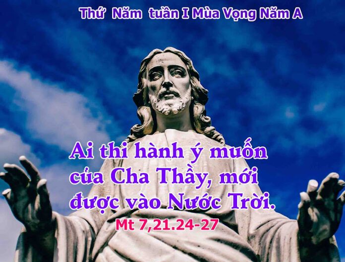 Lời Chúa trong đoạn Tin Mừng hôm nay nói về việc đặt nền móng xây dựng. Đó là xây nhà trên tảng đá vững chắc và xây nhà trên cát. Chúa Giêsu khen ngợi người xây nhà trên tảng đá. Và tảng đá ở đây là gì? Tảng đá chính là Đức Kitô và giáo lý của Ngài, Lời Ngài, Sự Sống của Ngài và những gương lành của Ngài. Khi dự trù xây một ngôi nhà, người ta lên phương án, đặt nền móng và xây lên. Cũng thế, để xây dựng căn nhà thiêng liêng, trước hết ta phải khảo sát nền đá vững chắc đó chính là Lời Chúa; đọc và lắng nghe Lời Chúa đó chính là việc chuẩn bị cho một nền tảng vững chắc và việc tiến hành xây, chính là đem Lời Chúa vào hành động của cuộc sống. Khởi đầu đoạn Tin Mừng hôm nay, Chúa Giêsu phán rằng: “Không phải bất cứ ai thưa với Thầy: ‘Lạy Chúa! Lạy Chúa!’ là sẽ được vào Nước Trời cả đâu! Nhưng chỉ ai thi hành ý muốn của Cha Thầy là Đấng ngự trên trời,” (c.21). Như vậy, đường vào Nước Trời, chỉ dành cho những ai làm theo ý muốn của Chúa Cha. Trong Ngày Phán Xét cho dù là những người có tài nói tiên tri hay những người làm được những điềm thiêng dấu lạ mà không thực thi thánh ý của Thiên Chúa thì cũng sẽ bị loại ra ngoài.