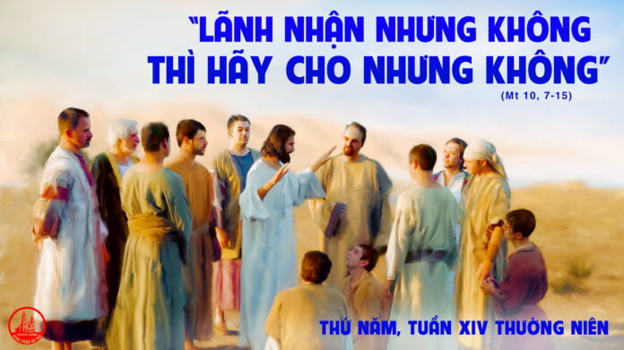 Tin Mừng hôm nay, Chúa Giêsu sai 12 Tông Đồ đi rao giảng Nước Trời với những lời dặn dò ân cần, thắm thiết: Anh em hãy đến với các con chiên lạc nhà Israel. Dọc đường hãy rao giảng rằng: Nước Trời đã đến gần. Anh em hãy chữa lành người đau yếu, làm cho kẻ chết chỗi dậy, cho người mắc bệnh phong được sạch, và khử trừ ma quỷ. Anh em đã được cho không, thì cũng phải cho không như vậy.