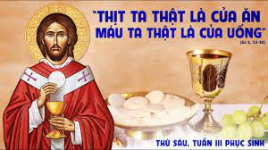 Chúa Giêsu nói với họ: “Thật, Tôi bảo thật các ông: Nếu các ông không ăn Thịt và uống Máu Con Người, các ông không có sự sống nơi mình”. Ai ăn Thịt và uống Máu Tôi, thì được sống muôn đời, và Tôi sẽ cho người ấy sống lại vào ngày sau hết. Vì Thịt Tôi thật là của ăn, và Máu Tôi thật là của uống. Ai ăn Thịt và uống Máu Tôi thì ở lại trong Tôi, và Tôi ở lại trong người ấy.
