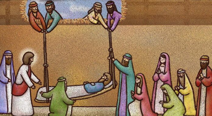 Bây giờ chúng ta bước theo một nhóm vài người. Họ đang khiêng một bệnh nhân bị bại liệt nằm trên giường. Họ bước đi trên đường với sức nặng của người bệnh, và người bệnh với sức nặng của bệnh tật. Họ tiến bước vất vả và chậm chạp, vì phải rất cẩn thận và phải cùng nhịp bước. Có lẽ chúng ta cũng có lần chứng kiến những người tải bệnh nhân trên cáng, trên chõng hoặc trên võng, với quãng đường xa vất vả. Những người kia, họ đi đâu và để làm gì? Họ đang tiến về phía một người mà họ tin người đó chữa lành bệnh nhân của họ.
