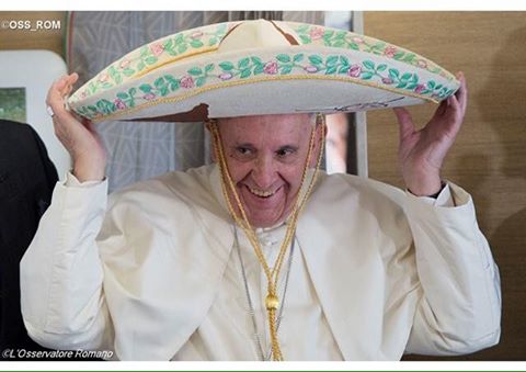 Tiếp đến, bà Valentina, người Mêhicô, niên trưởng các ký giả tháp tùng ĐTC, đã tặng ngài chiếc mũ vành rộng của Mêhicô, để ngài không bị nắng và giống người Mêhicô hơn!